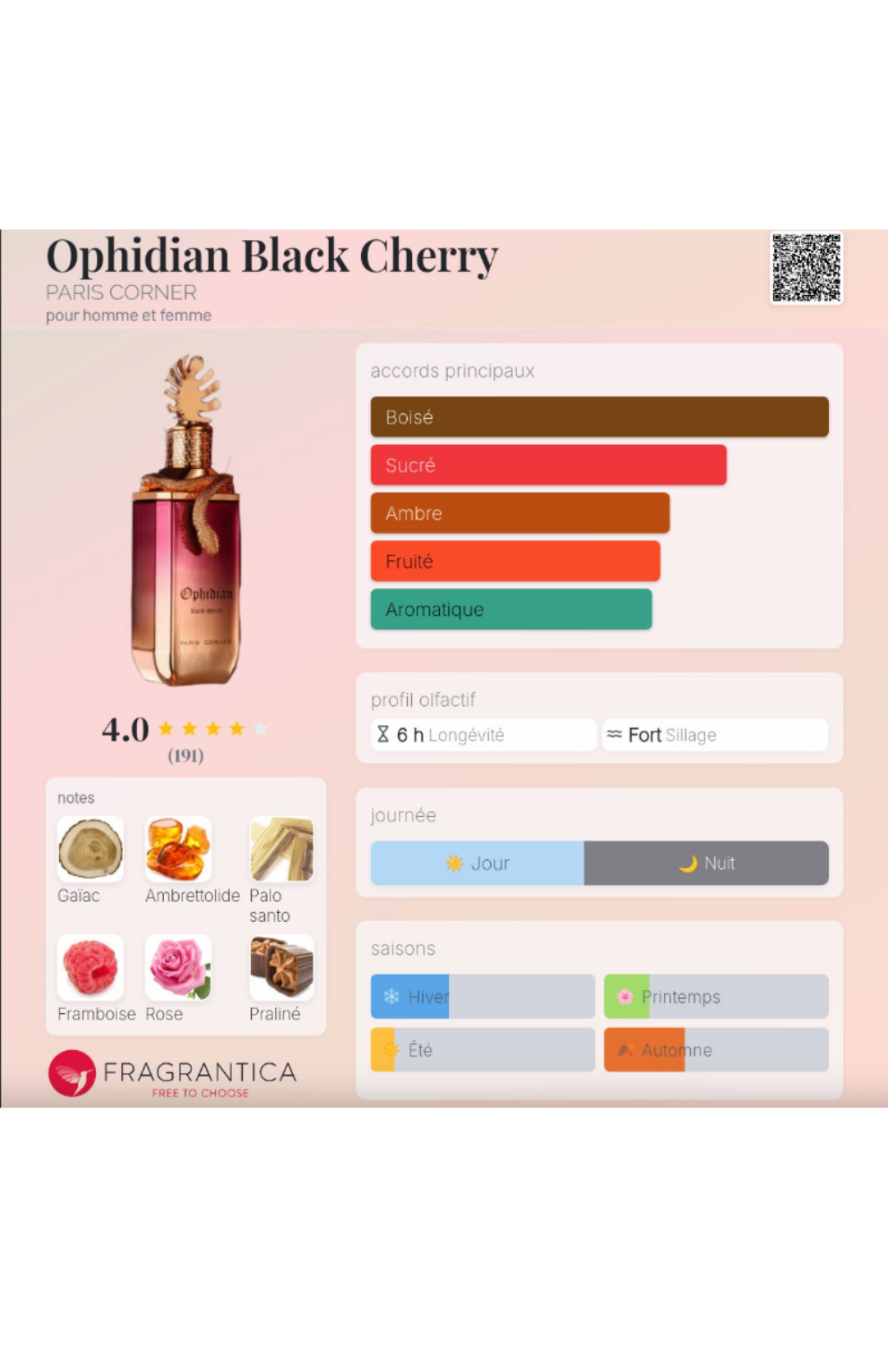 Plus qu’un parfum, Ophidian Black Cherry  est une déclaration. Elle s’adresse aux personnalités fortes, à celles qui possèdent une volonté inébranlable et une élégance naturelle. Portée de jour comme de nuit, elle devient une signature olfactive inoubliable