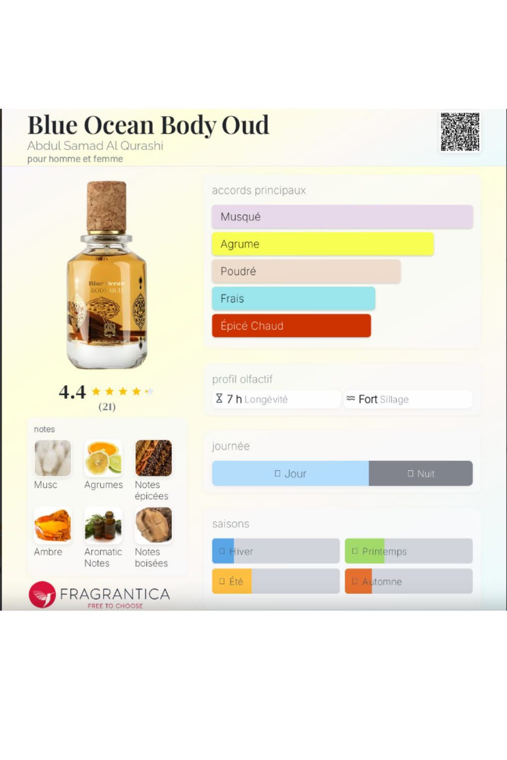 Body Oud – Blue Ocean est une création signée Abdul Samad Al Qurashi, maître parfumeur reconnu dans l’art du parfum oriental de luxe. Élégant et intemporel, ce parfum est le compagnon idéal de ceux qui veulent affirmer leur présence avec distinction.