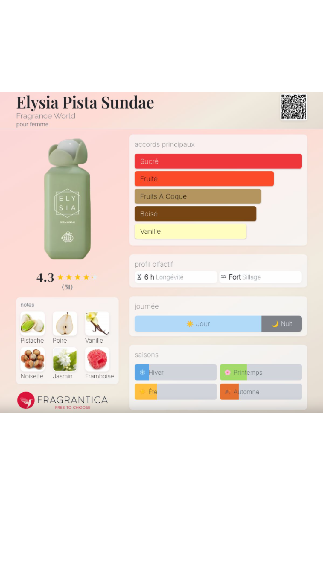 Enfin, la base légèrement boisée et vanillée prolonge la tenue de Elysia Pista Sundae parfum, laissant derrière elle un sillage chaud, doux et inoubliable.