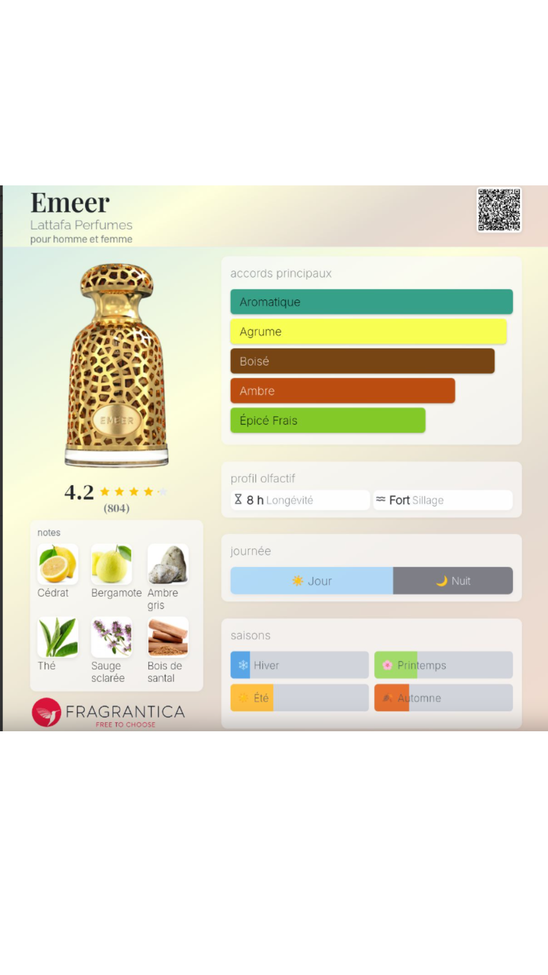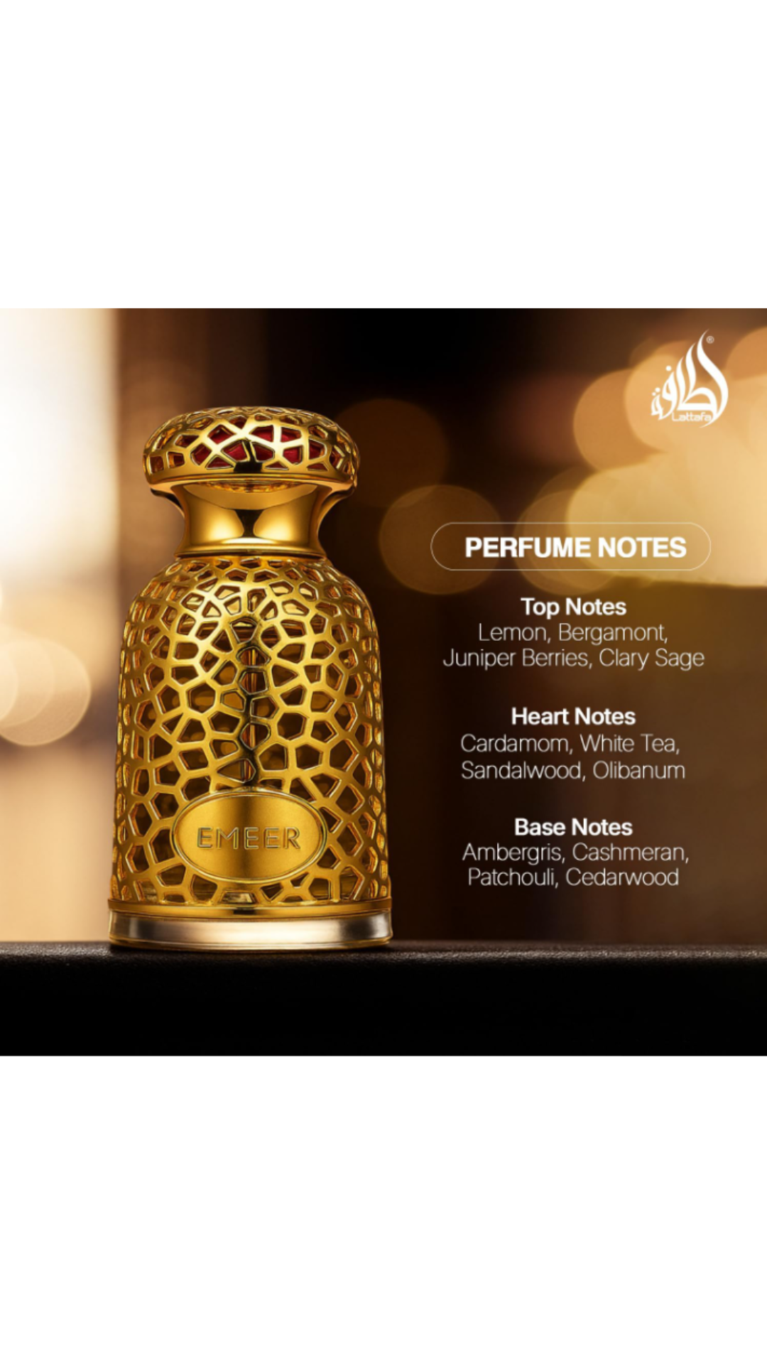 Cette fragrance s’ouvre sur des notes élégantes et profondes qui symbolisent la puissance et la prestance. Son cœur révèle un équilibre parfait entre richesse aromatique et douceur, créant une expérience sensorielle inoubliable. Véritable hommage à la noblesse et à la sophistication, Emeer est le reflet d’un goût affirmé et d’une personnalité charismatique.