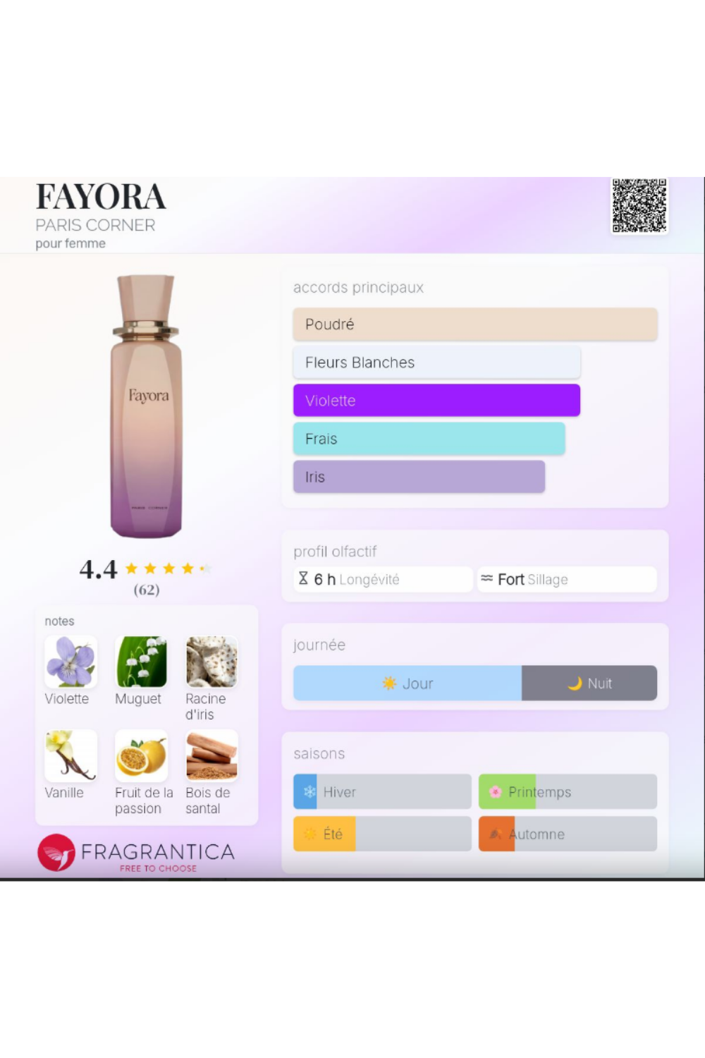 - Notes de cœur : Iris, Jasmin, Muguet, Violette