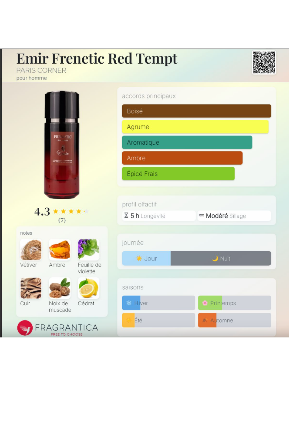 Frenetic Red Tempt débute par une explosion captivante de fleur de muscade, lavande, cèdre, mandarine, camomille, aubépine, bergamote et citron.