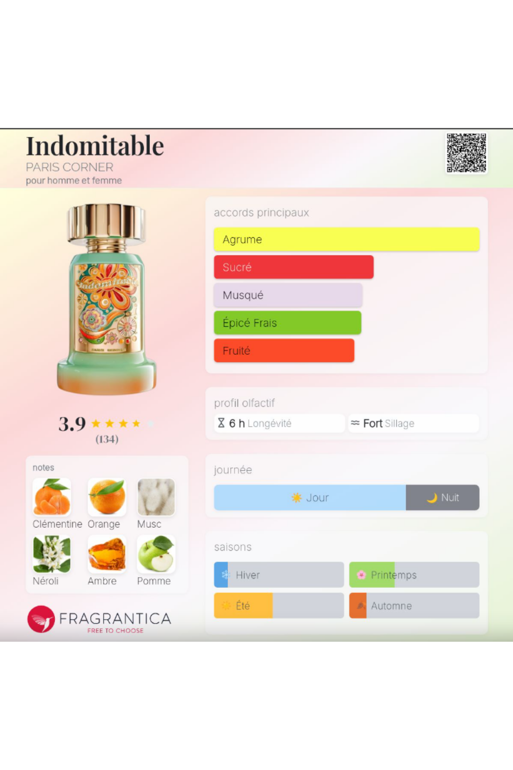 Indomptable rend hommage à la force éclatante du printemps et à la lumière dorée de l’été. Dès les premières notes, une explosion de clémentine radieuse et d’oranges mûries au soleil offre une fraîcheur fruitée et vivifiante qui capte immédiatement l’attention.