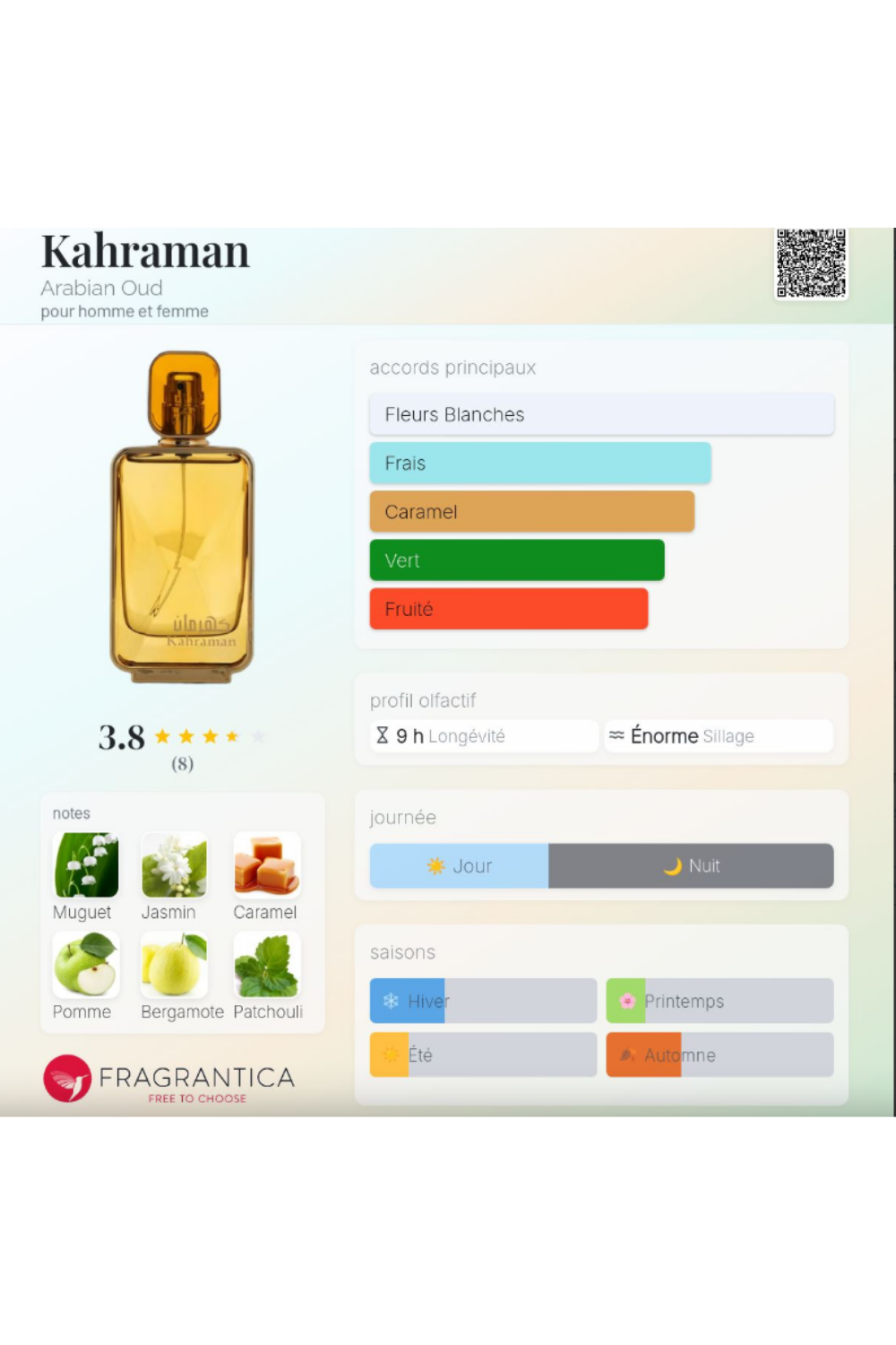 Kahraman s’ouvre sur des notes de tête vivifiantes de bergamote et de pomme verte, offrant une fraîcheur éclatante dès les premiers instants.