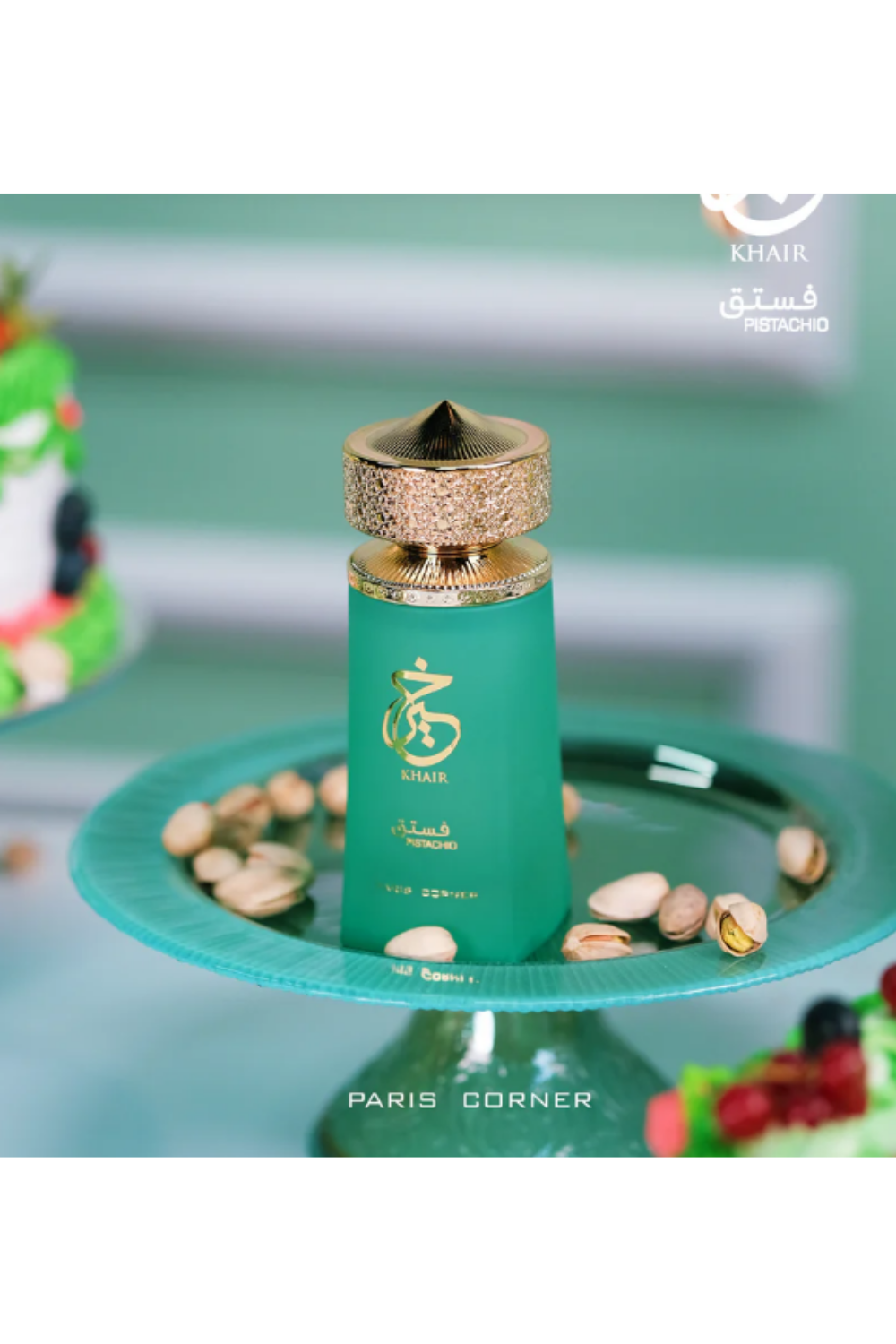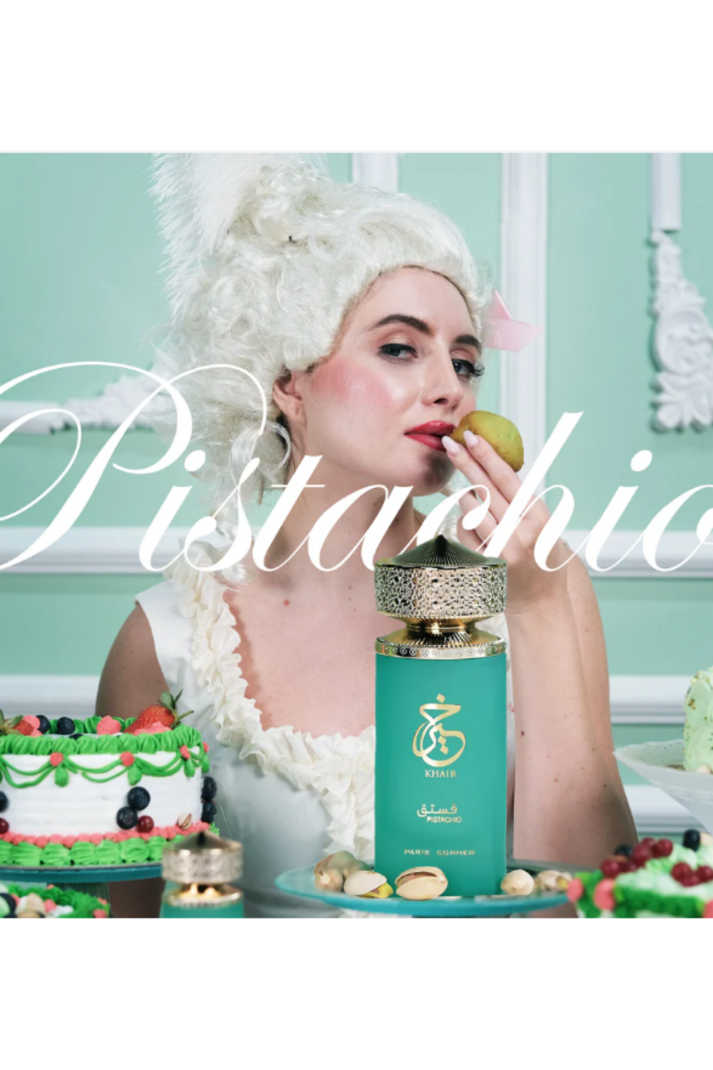 Khair Pistachio s’ouvre sur une composition olfactive délicate et gourmande, mêlant la fraîcheur pétillante de la bergamote italienne à la douceur de la glace à la pistache. Des notes de noisette, rhum subtil et cardamome viennent compléter ce départ, créant une ouverture à la fois raffinée et sensuelle.