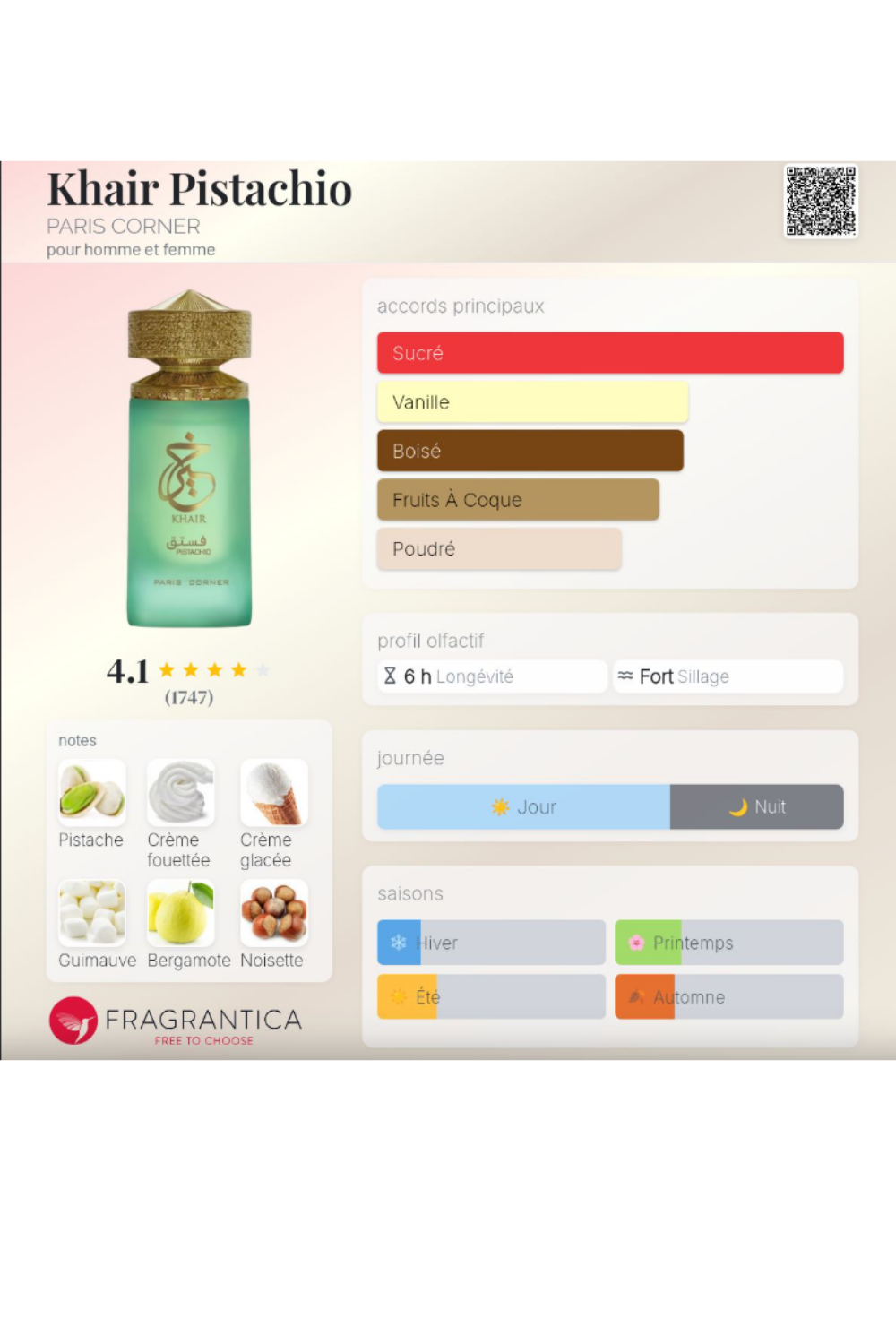 Enfin, le fond enveloppe la peau d’une chaleur gourmande et réconfortante. La chantilly, les marshmallows, la barbe à papa et le nougat se mêlent aux bois précieux de cèdre et santal, ainsi qu’à la fève tonka et au cacao. Ce mélange laisse une empreinte profonde et persistante, faisant de Khair Pistachio une fragrance unique, captivante et irrésistible