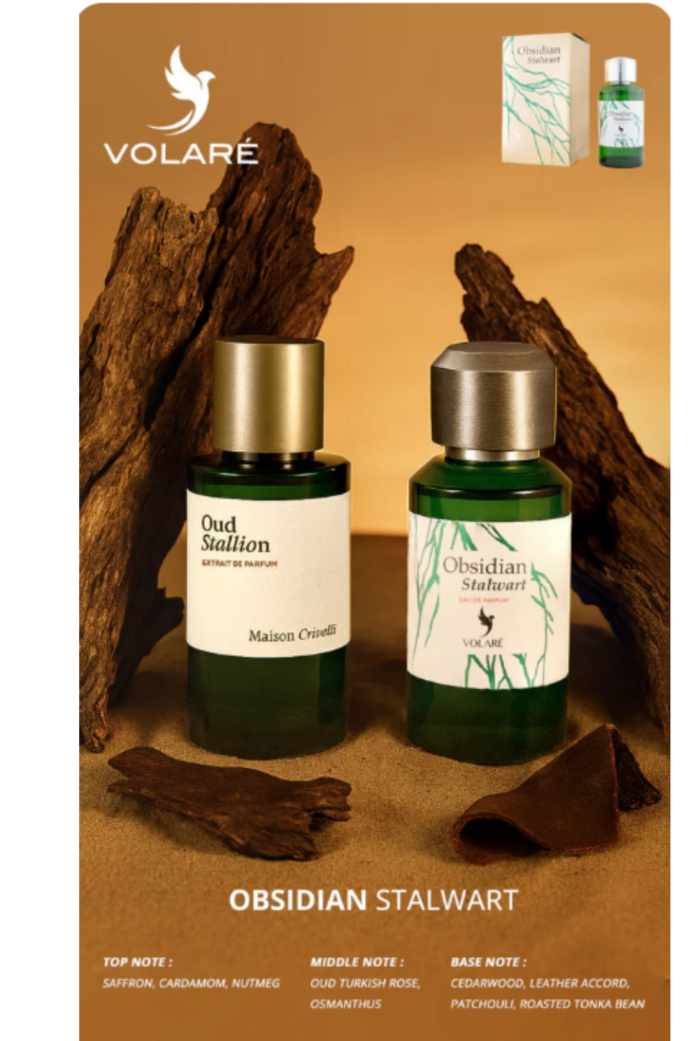 Obsidian Stalwart est un Eau de Parfum  qui combine des notes épicées de safran, cardamome et muscade à un cœur floral luxueux de rose, jasmin et osmanthus, le tout reposant sur un sillage intense de oud, cuir, tonka, patchouli et cèdre.