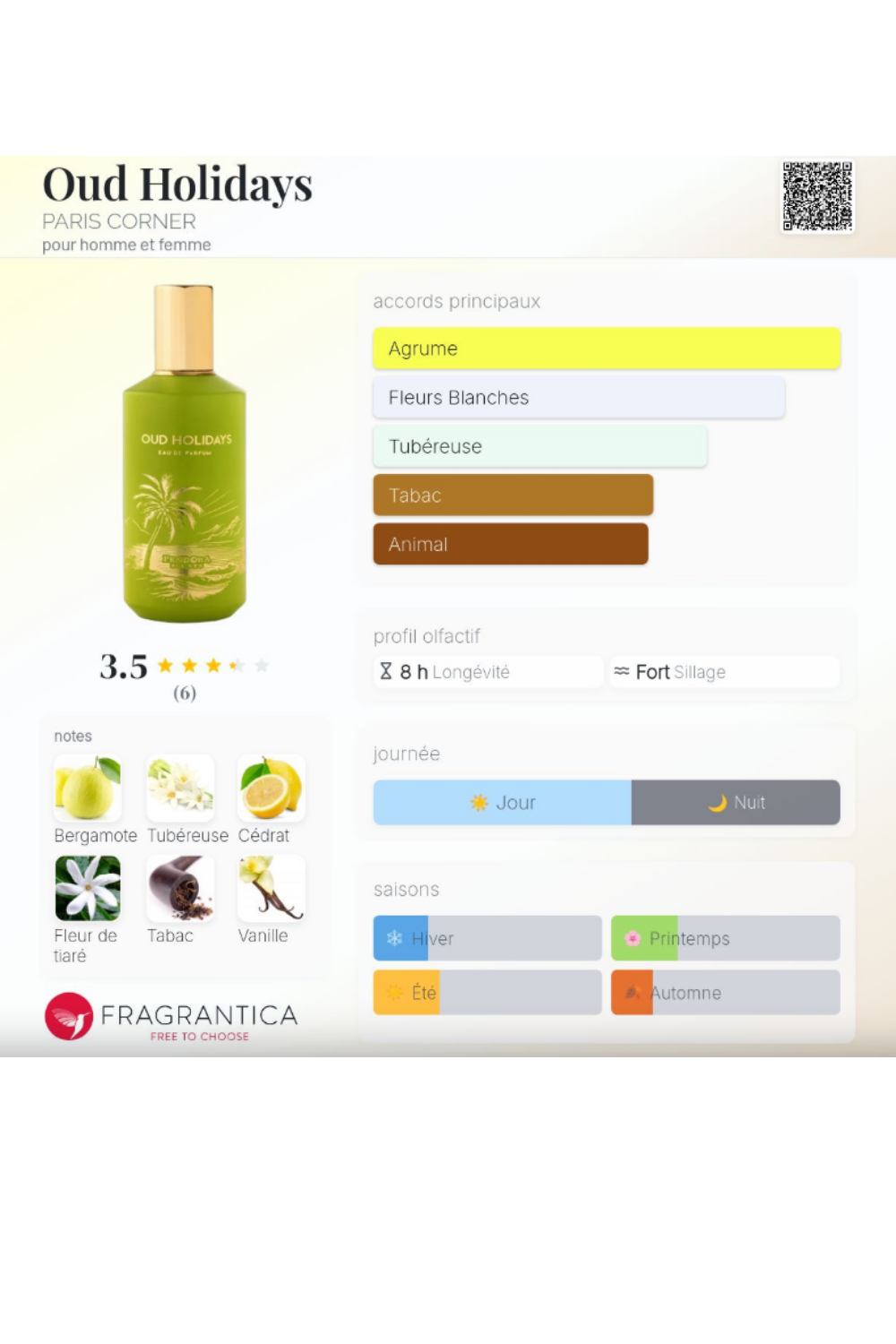 Oud Holidays laisse une impression sophistiquée. Son équilibre entre fraîcheur, chaleur et profondeur le rend polyvalent. Idéal pour les grandes occasions ou pour se distinguer avec élégance.