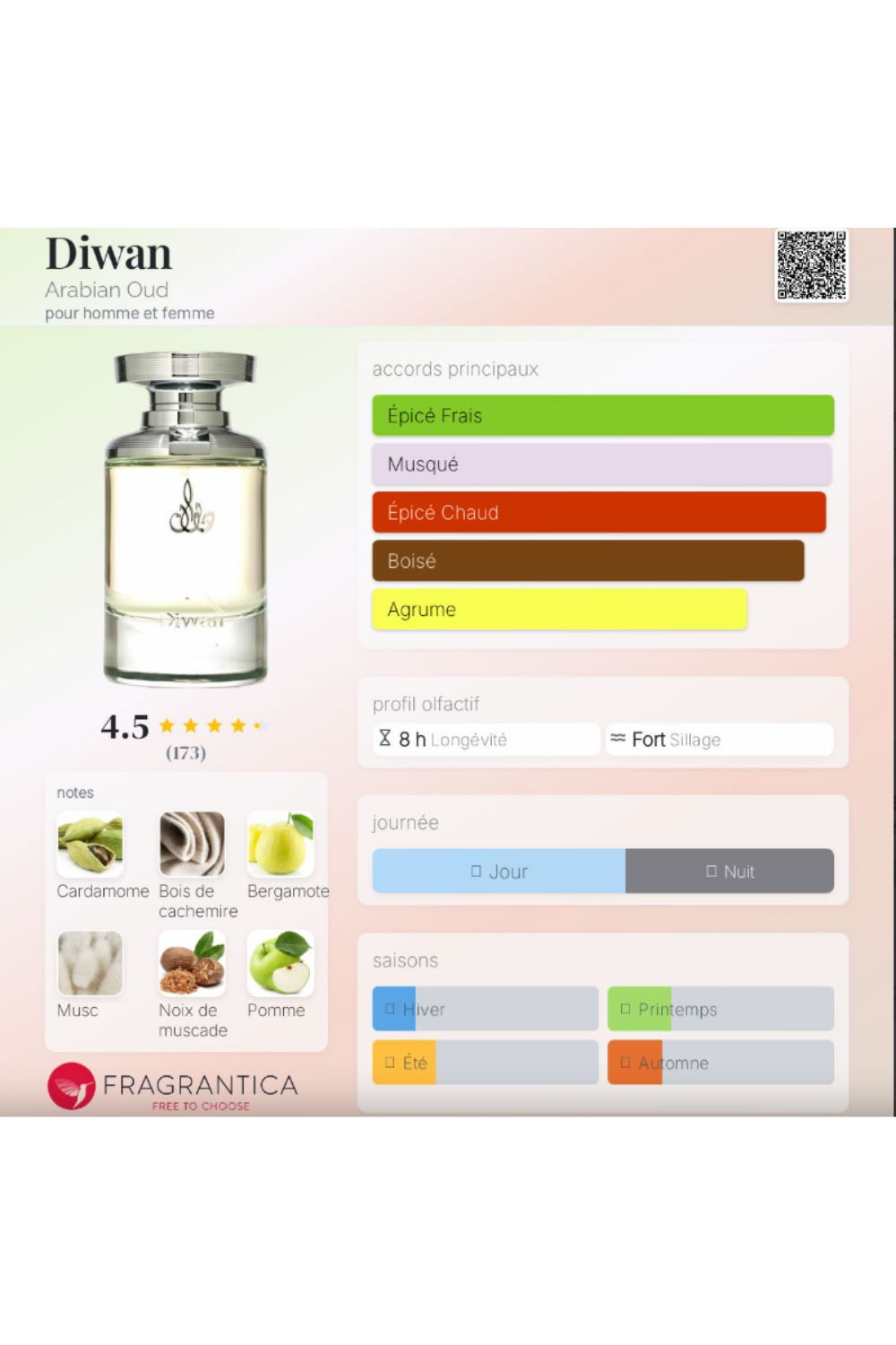 De cette fusion est né un parfum qui raconte les versets aromatiques à travers son « diwan ». « Diwan » signifie « lieu de pouvoir », un conte incarné par votre parfum