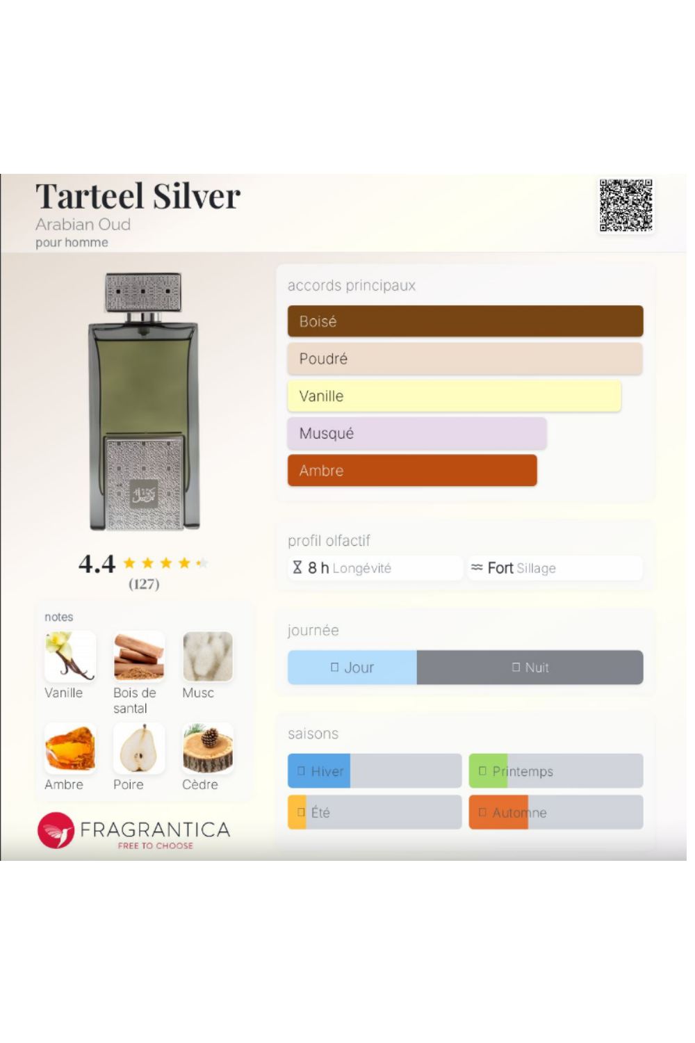 Plus qu’un parfum, Tarteel Silver est une signature olfactive. Il reflète un style affirmé et accompagne l’homme en toutes occasions, de jour comme de nuit, avec assurance et distinction.