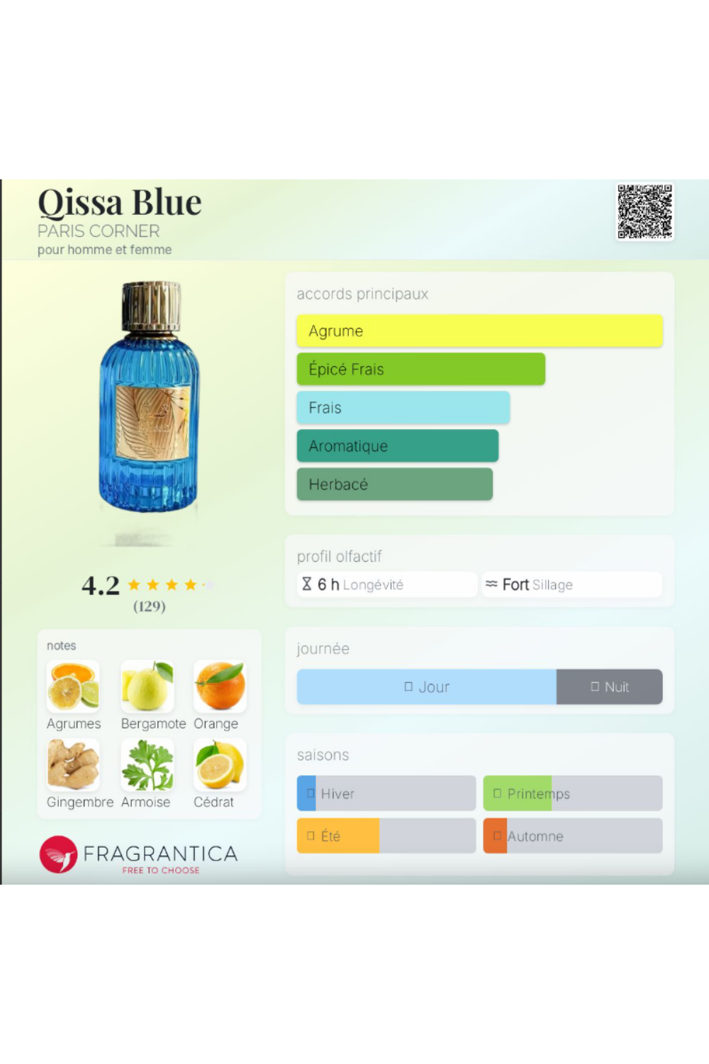 - Notes de tête : Agrumes, Armoise, Bergamote, Citron, Ylang-ylang, Cuir et Encens
