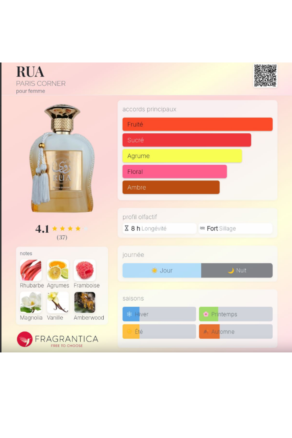 Au cœur de Rua, le parfum s’épanouit avec une fusion délicate de magnolia, vanille, framboise et pêche, créant une harmonie parfaite entre élégance florale et douceur exquise. Ces accords raffinés font de Rua une fragrance féminine à la fois tendre et sophistiquée.