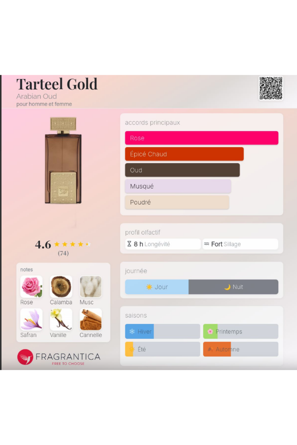 Plus qu’une fragrance, Gold Tarteel est une invitation à l’évasion, une touche d’élégance intemporelle qui reflète le charme et le prestige d’Arabian Oud