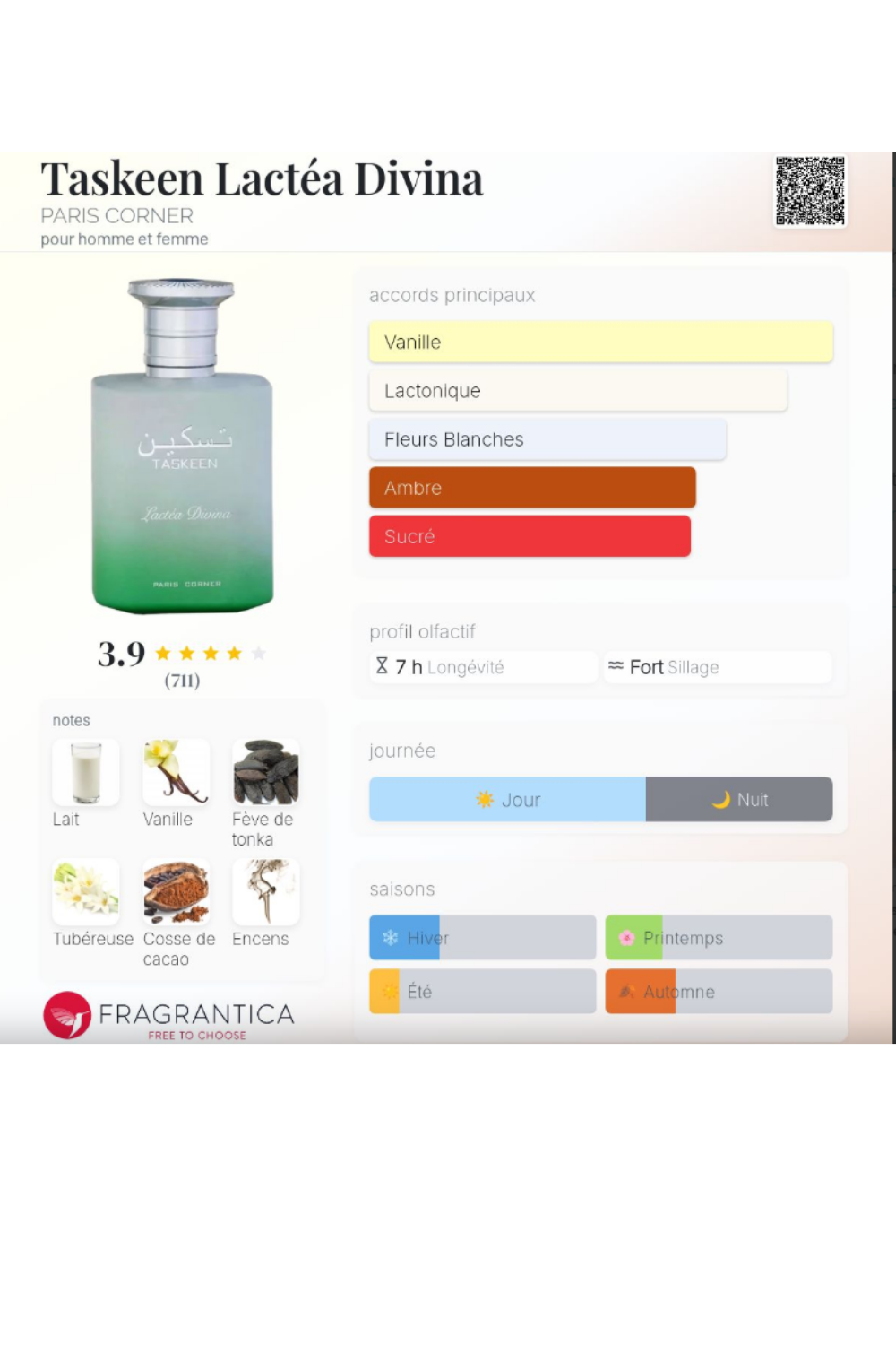 Succombez à l’élégance et à la douceur de Taskeen Lactea Divina, une eau de parfum unique signée Paris Corner. Cette fragrance raffinée mêle des notes crémeuses et apaisantes à une profondeur sensuelle, offrant un parfait équilibre entre gourmandise et sophistication.