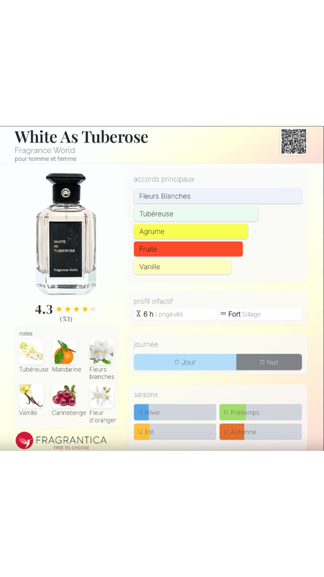 Explorez la délicate beauté de « White as Tuberose » de Fragrance World, un parfum qui célèbre la féminité dans toute sa splendeur. Les notes de tête envoûtantes de tubéreuse, de pêche et de mandarine créent une ouverture florale et fruitée. Au cœur, un mélange harmonieux de fleurs blanches, de canneberges et de vanille offre une douceur élégante et raffinée. Les notes de fond, composées de musc, de fleur d’oranger et de bois de santal, ajoutent une profondeur sensuelle à la composition. « White as Tuberose » est une ode olfactive à la grâce et à la délicatesse. Laissez-vous envelopper par cette fragrance exceptionnelle